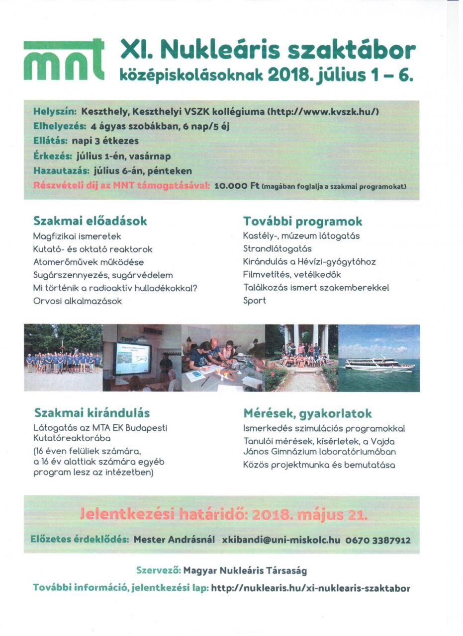 A Magyar Nukleáris Társaság 2018.július 1-től 6-ig szervezi a XI. Nukleáris szaktábort Keszthelyen. A programban szakmai előadások, reaktorlátogatás, laborgyakorlatok és szabadidős programok szerepelnek.